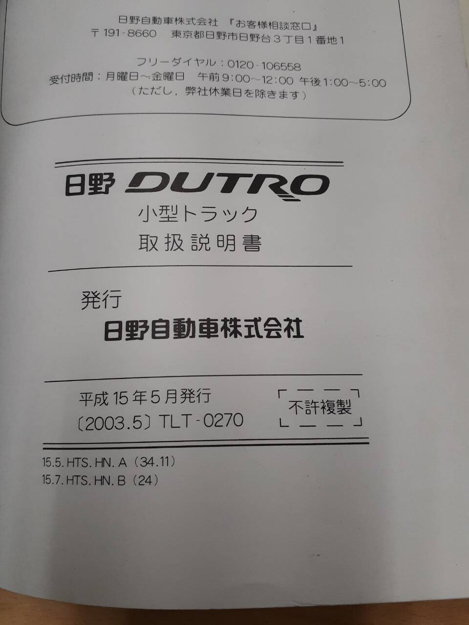 日野 デュトロ 取扱説明書 中古