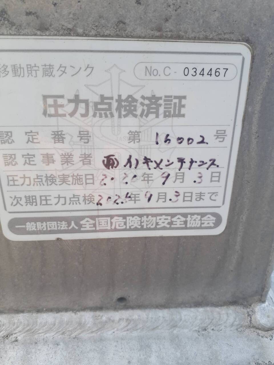 タツノ・メカトロニクス 1.9KLタンク 型式L20D-1 製造年月2005年7月