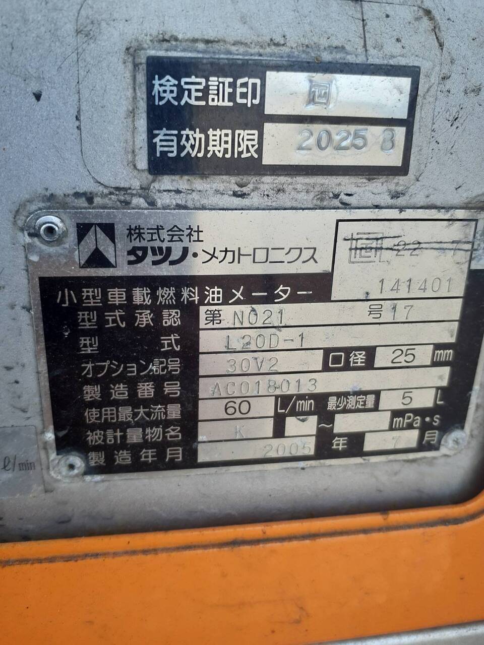 タツノ・メカトロニクス 1.9KLタンク 型式L20D-1 製造年月2005年7月 トラックから取り外す前は、電源付いたのを確認済み。動作は不明