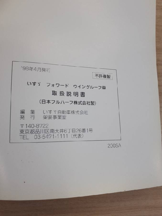 いすゞ フォワード ウイングルーフ車 取説 1998年4月発行