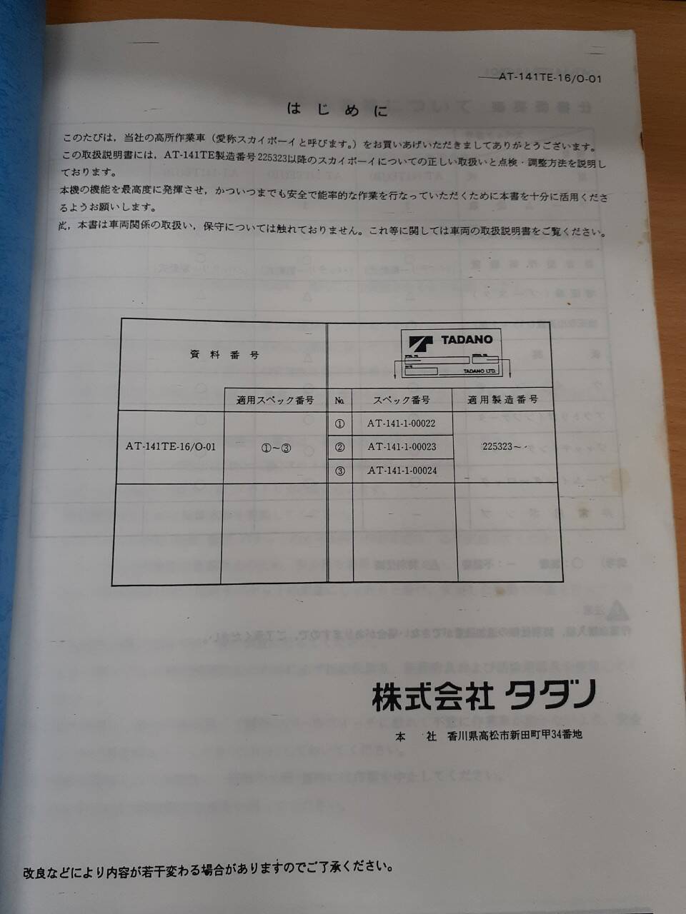 LP06-0903【兵庫県神戸市発】TADANO★スカイボーイ取扱説明書★AT-141TE